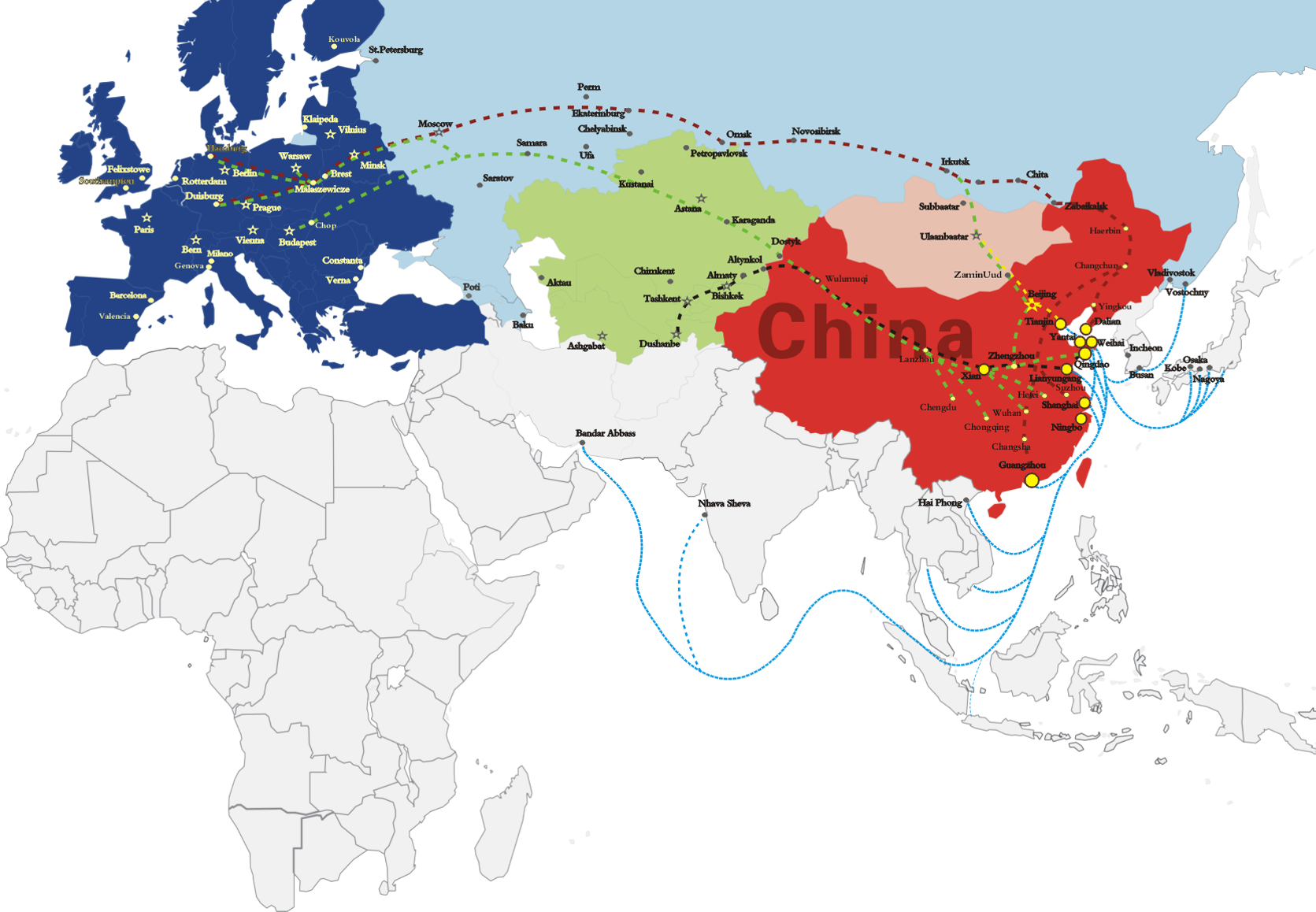 始发站--阿拉山口/多斯托克(霍尔果斯/阿腾科里)--中亚五国、俄罗斯等;